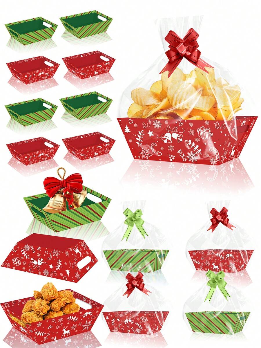 12pcs Christmas Party Baskets With Cellophane Bags, With Transparent Bags, Bows, Gift Baskets For Gifts Empty, Suitable For Christmas, Table Decorations, Birthdays, Wedding Parties
