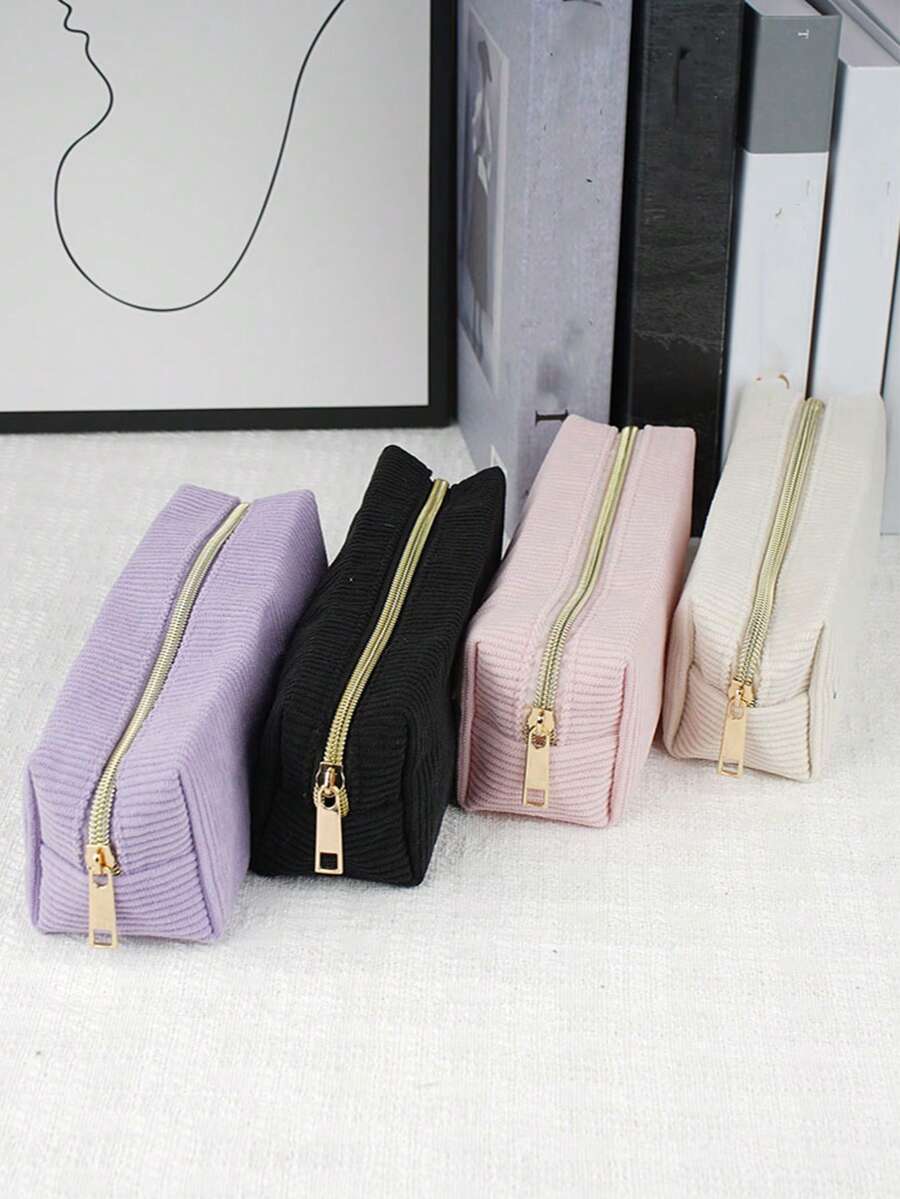 1pc Corduroy Zipper Pencil Case, Striped Design Pen Bag, Daily Small Items And Student Stationery Storage, Women's Cosmetic Pouch, Pen Organizer Bag, Back To School Essential Gift, School Supplies (Black)