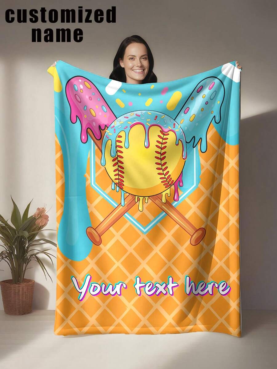 1pc Customizable Baseball Themed Fleece Blanket, Featuring Ice Cream, Sprinkles, And Waffle Texture Design, Soft & Comfortable, Machine Washable, Digital Printed Polyester Fabric, Suitable For Sofa, Bed, Travel, Camping, Living Room, Office, Seats - Great Gift For Family And Friends