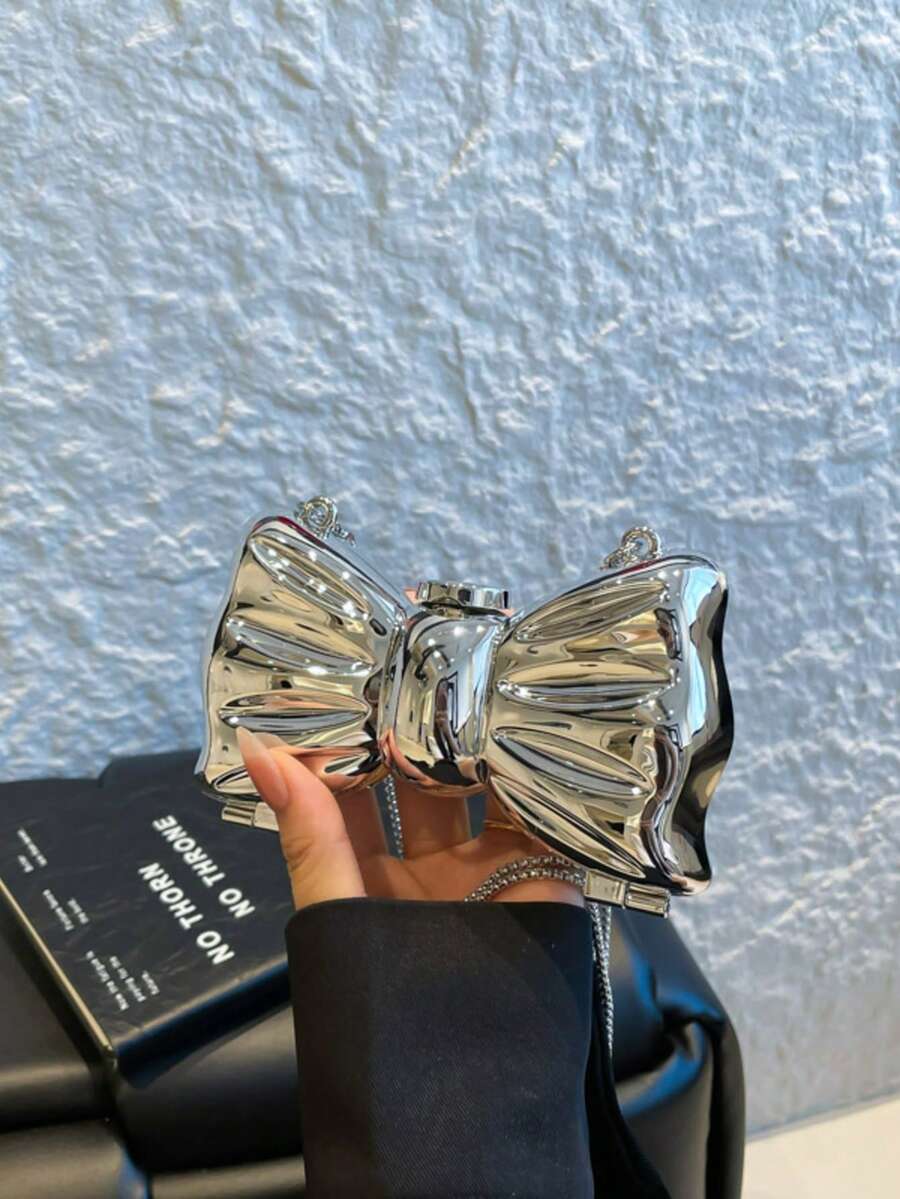 1pc Mini Metal Silver Bow Decor Cute Crossbody Bag, Mini Evening Clutch Bag With Metal Bow Detail, Fashionable Personalized Girl's Chain Bag, Suitable For Party And Date, Shoulder Crossbody Bag For Female, Best Gift For Friends And Family