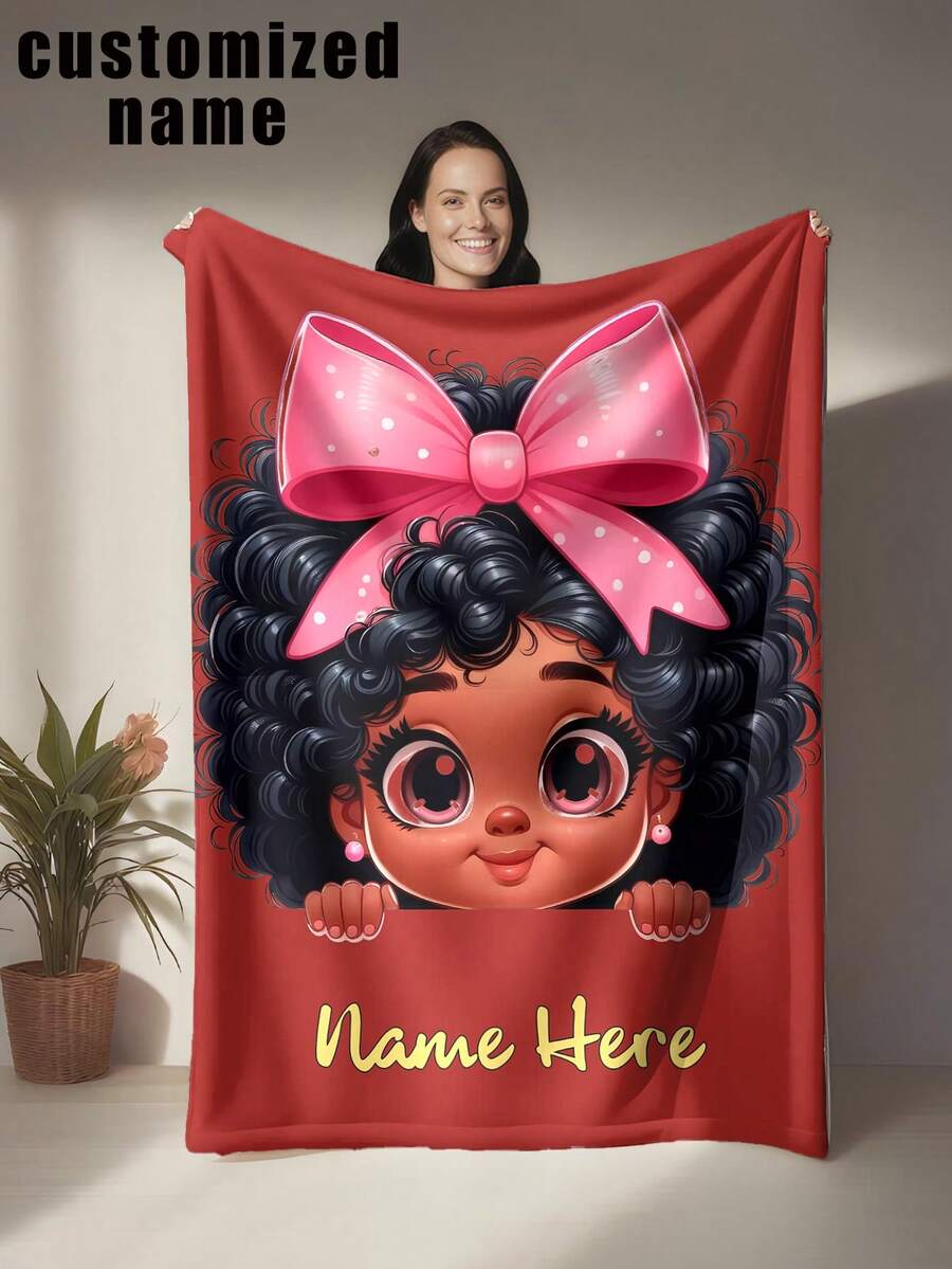 1pc Personalized Name Blanket With Cartoon Girl Character & Bow Design, Soft Warm Flannel Blanket, Memorable Gift Idea For Birthday, Christmas, Family, Friends, Suitable For Bedroom, Living Room, Sofa, Bed, Office, Car, Great For Napping, Lightweight Outdoor Travel - 1 Polyester Blend
