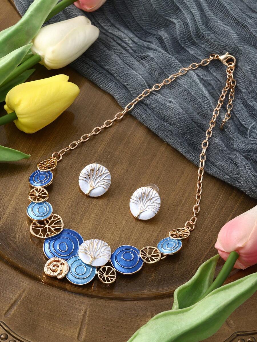 1set Bohemian Zinc Alloy Enamel Lucky Tree Design Necklace And Earring Set, Ideal Gift For Women'S Anniversary/Birthday