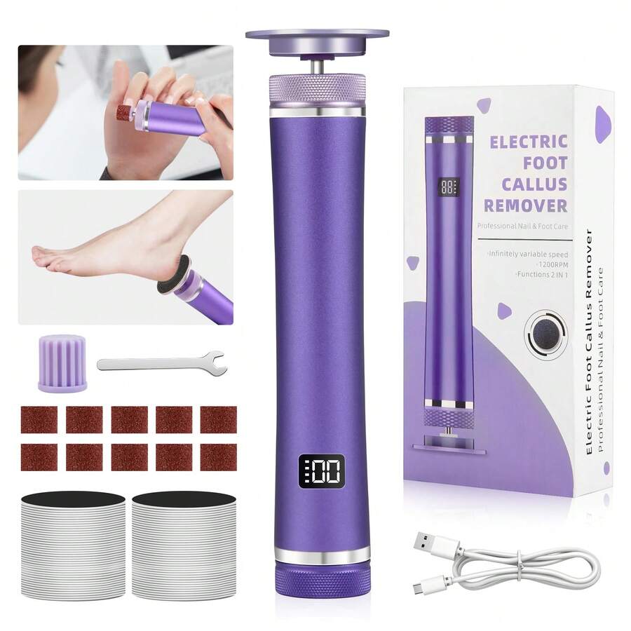 2000mAh Electric Foot Callus Remover, 12-Level Adjustable Pedicure Tool With LED Display, 2-In-1 Cordless Foot File And Nail Grinder With 60 Sandpaper Pieces