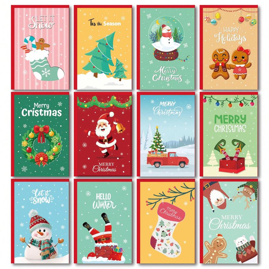 26-Piece Christmas Card Set - 12 Folded Cards (10x15cm) + 12 Red Envelopes + 2 Stickers,12 Unique Christmas Designs (Santa, Gingerbread, Boots, Snowmen & More), Cute Cartoon Greeting Cards For Festive Holidays, Birthday Gifts, Thank-You Notes & Party Invitations, Heartwarming Gifts For Family & Friends ,Perfect Winter Holiday Decor & Personalized Wishes