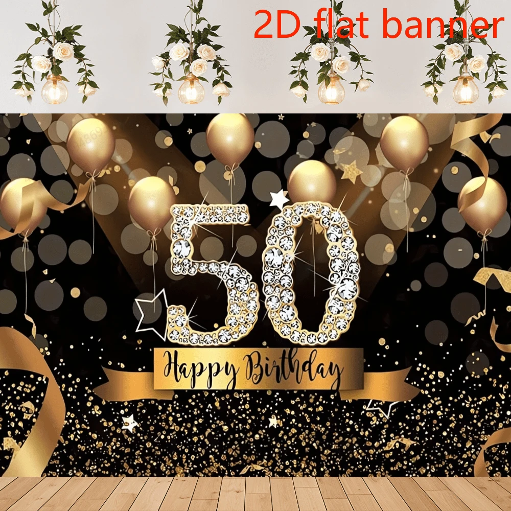 2D Flat Banner 50th Birthday Party Backdrop Banner - Polyester Black & Golden Glitter Balloon Design For 50 Years Old Celebration - Multipurpose Photography Background For Indoor & Outdoor Decor