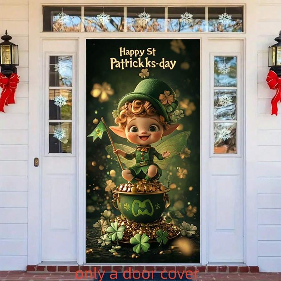 2Dflat,1pc St. Patrick's Day Door Cover, Polyester Banner, Gnome And Shamrock Design, Multi-Purpose Holiday Outdoor Decoration, No Electricity Required, Green Door Hanging Sign For Party Decoration