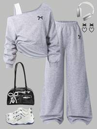 JeanioriteSHEIN Tween Girl Sweatshirt Set, Long Sleeve Green Ribbed Cuffs, Hem, Collar, Side Ribbon Bow, Knit Waist Pants With Pink Side Ribbon, Suitable For Autumn/Winter Outings, Shopping, Vacation, Commuting, Can Be Paired With Coats, Jackets #10 Bestseller