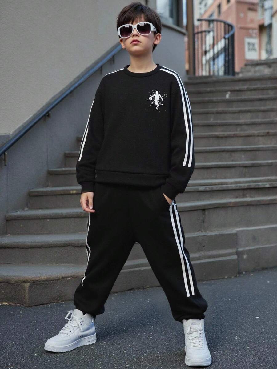 SHEIN 2pcs/Set Kids Tween Boy Casual Sports Patchwork Long Sleeve Crew Neck Sweatshirt And Pants Knit Tracksuit Set, Suitable For Commuting, School, Daily Casual, Travel, Sports, Spring/Summer/Autumn/Winter, Fleece, Thickened