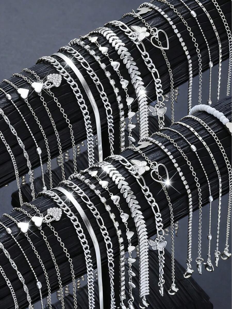 38pcs/19pcs/7pcs Set Women Elegant Vacation Style Hollow Butterfly & Heart Pendant Silver Anklet Set, Fashionable Jewelry For Girls Daily, Beach, Vacation