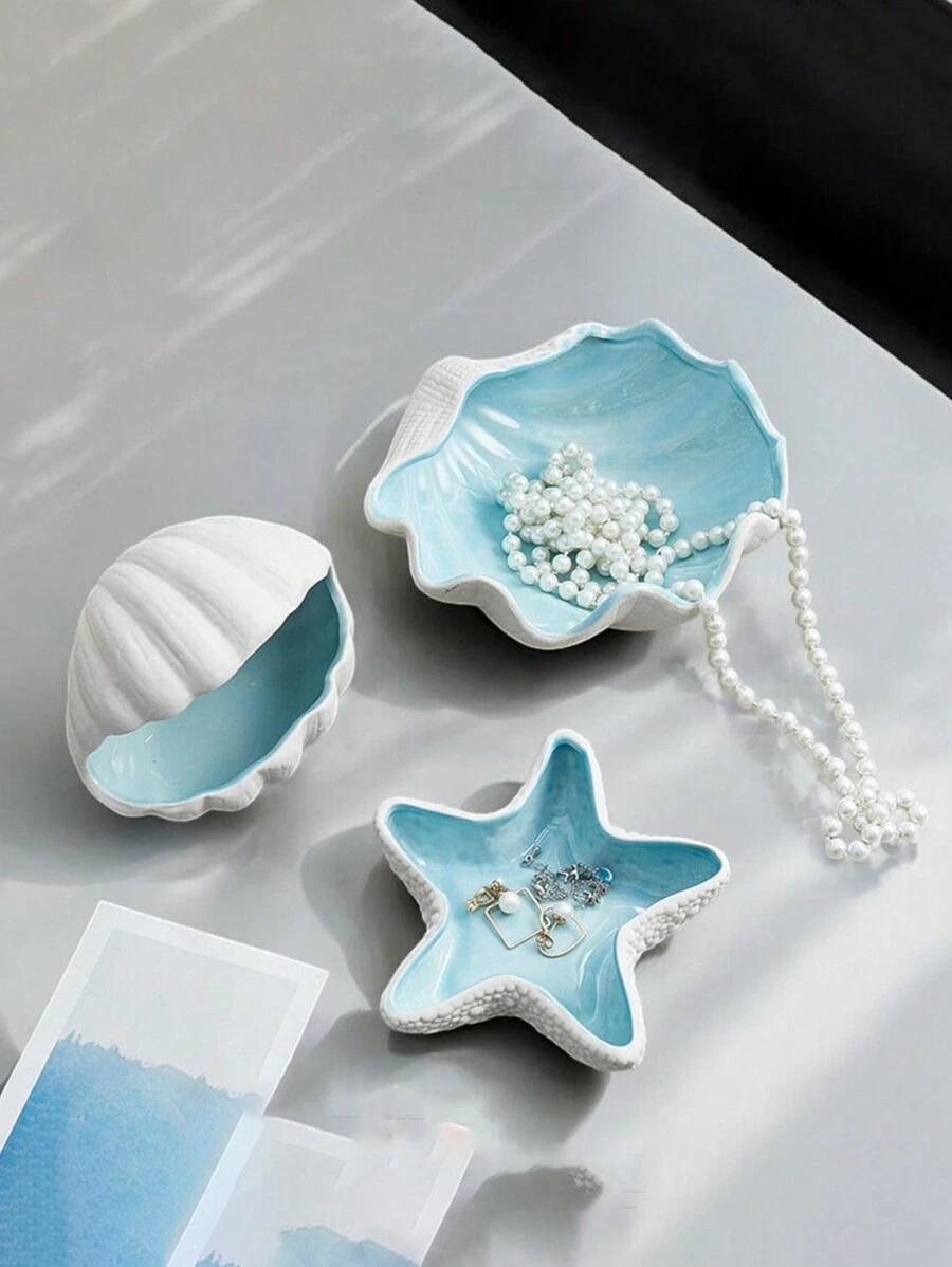 3pcs/1pc 5.51*2.36*2.76 Inch Sky Blue Shell Shaped Jewelry Tray & Key Bowl, Ceramic Jewelry Storage Tray. Birthday Gift, Graduation Gift