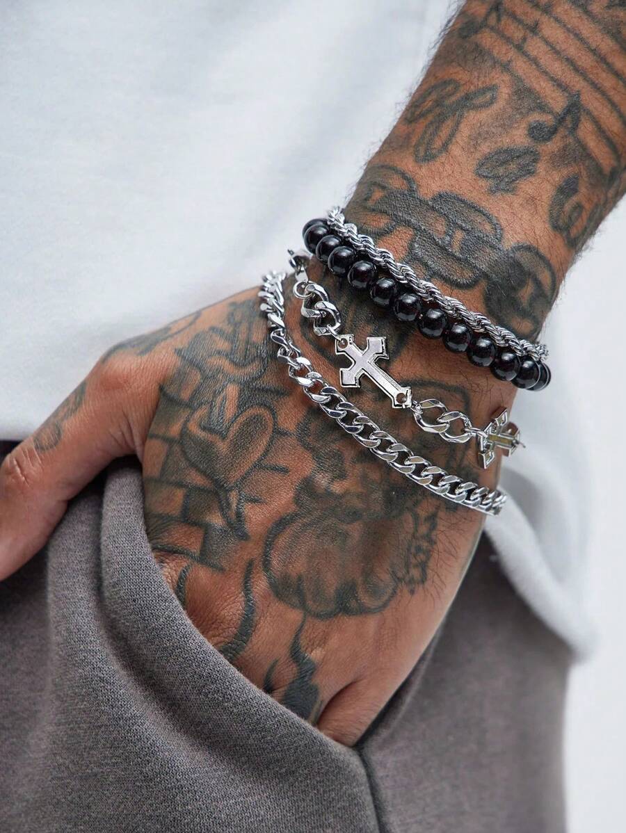 3pcs/4pcs/8pcs Set Men's Stainless Steel Cross & Cubic Zirconia Bracelet, Unisex Business Punk Style For Commute, Campus, Streetwear, Casual Outfit