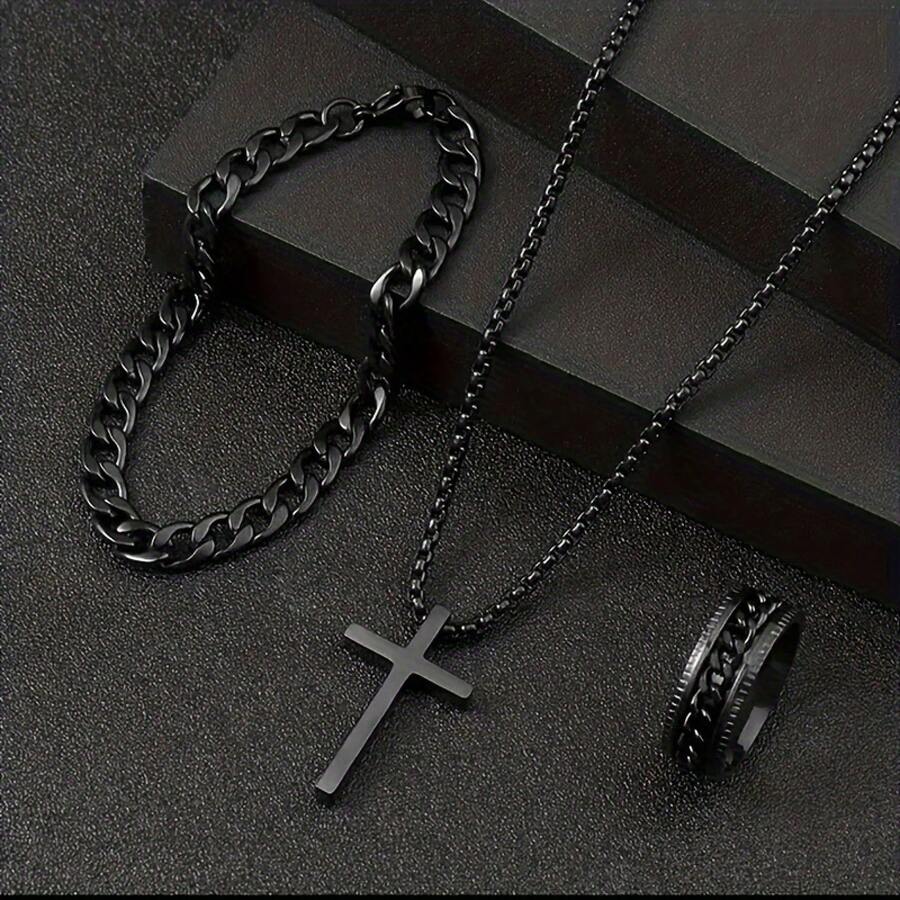 3PCS Multi-Functional Men's Jewelry Set - Black Cross Stainless Steel Necklace, Bangle And Ring For Fashionable Men