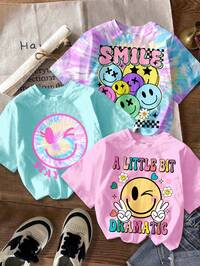Set de 3 camisetas de manga corta con cuello redondo, de estilo minimalista y casual, con estampados de rostros personalizados en colores brillantes azul, rosa y tie-dye, adecuadas para niñas preadolescentes, para uso diario, campus, salidas, calle, vacaciones, regreso a clases, primavera y verano, para una comodidad y estilo relajado, gráficos de rostros de dibujos animados, nueva , chic y relajado #2 Más vendidos