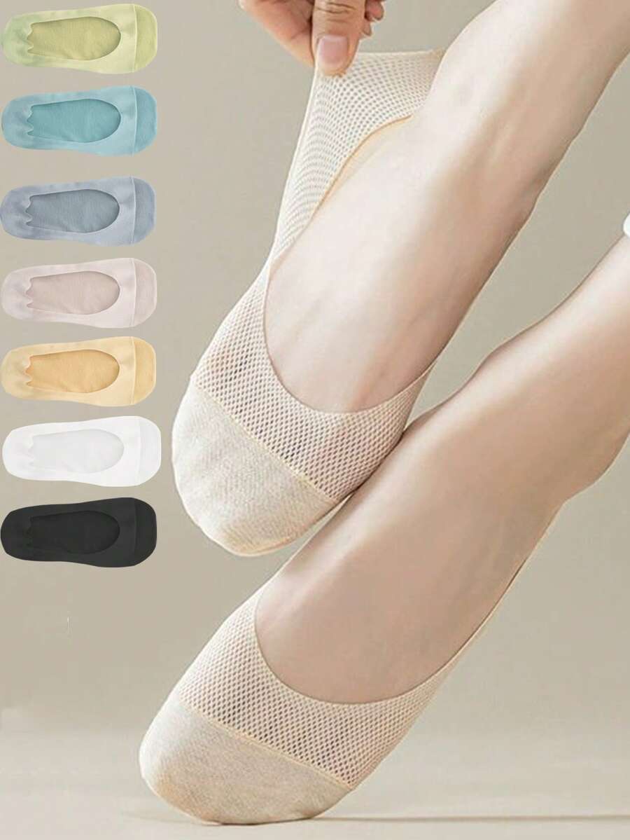 5 Pairs Women's Ice Silk Boat Socks Thin Breathable Invisible Anti-Slip Spring Summer Short Socks Fashionable Solid Color Shallow Mouth Mesh Short Socks