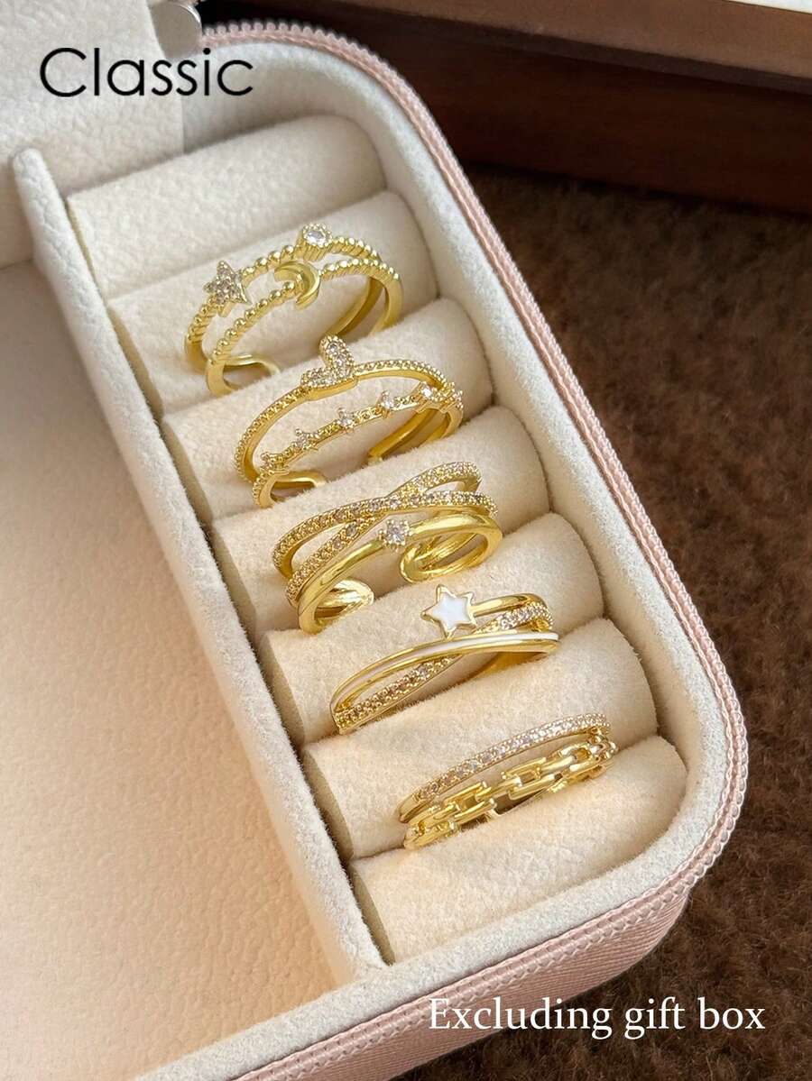 5pcs Elegant Luxury Floral, Leaf, Geometric Copper Micro-Inlaid Synthetic Zirconia Rings Set, Suitable For Vacation, Party, Wedding, Daily Wear