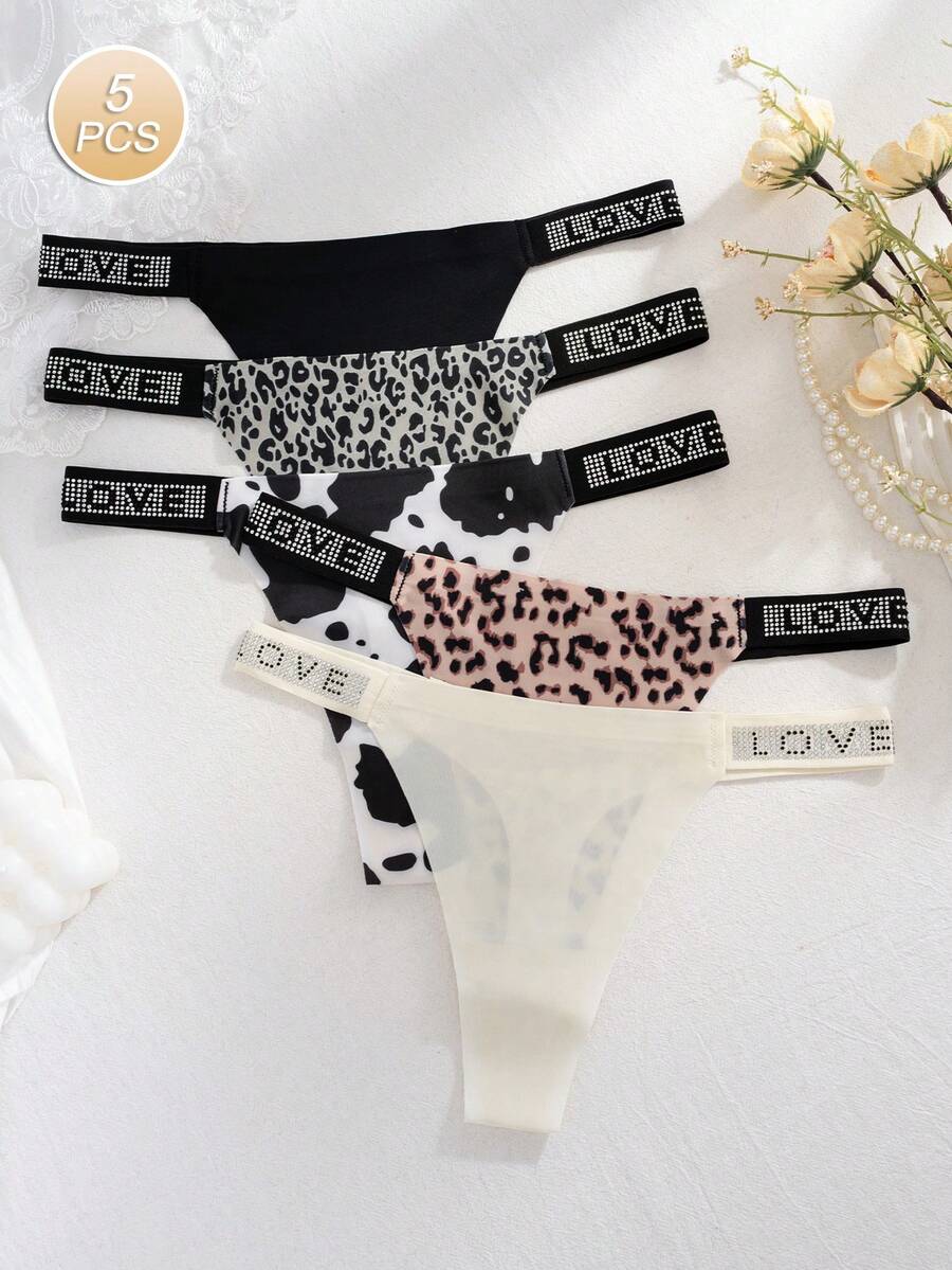5pcs/Pack Comfortable & Skin-Friendly LOVE Diamond Decor Sexy Leopard Print Seamless Thong Panties For Women