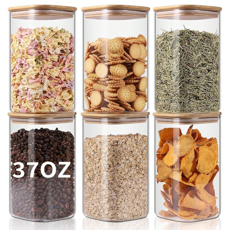 6PCS Glass Storage Jars, 37oz Clear Glass Food Storage Container With Sealed Bamboo Lid Stackable Kitchen Jars For Candy, Biscuits, Rice, Sugar, Flour, Pasta, Nuts & Spice Jars (Square)