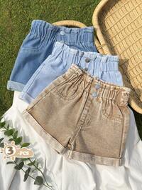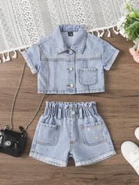 Baby Girls' Denim Lightweight Summer New Arrival, Washed Khaki Color, Cute & Sweet Streetwear Fashion, Vacation Design, Collared Short Sleeve, Single-Breasted Button Front, Chest Pockets, Elastic Waist Shorts, Soft Comfortable Cotton Denim Fabric, Daily Wear, Party, School, Commute, 2026 Summer New Collection