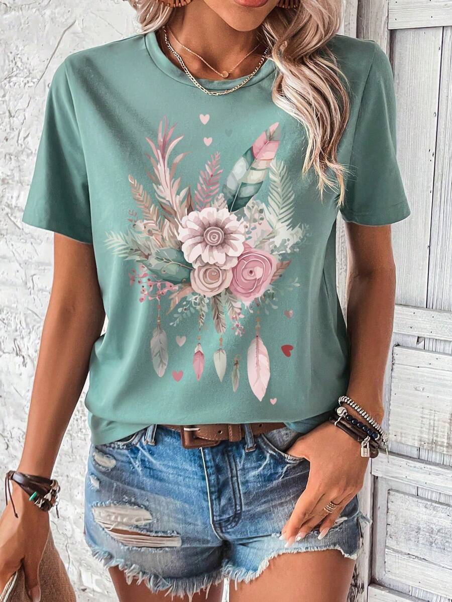 SHEIN LUNE Casual Floral Print Round Neck Short Sleeve Fitted Ladies T-Shirt, Summer Suitable For Going Out