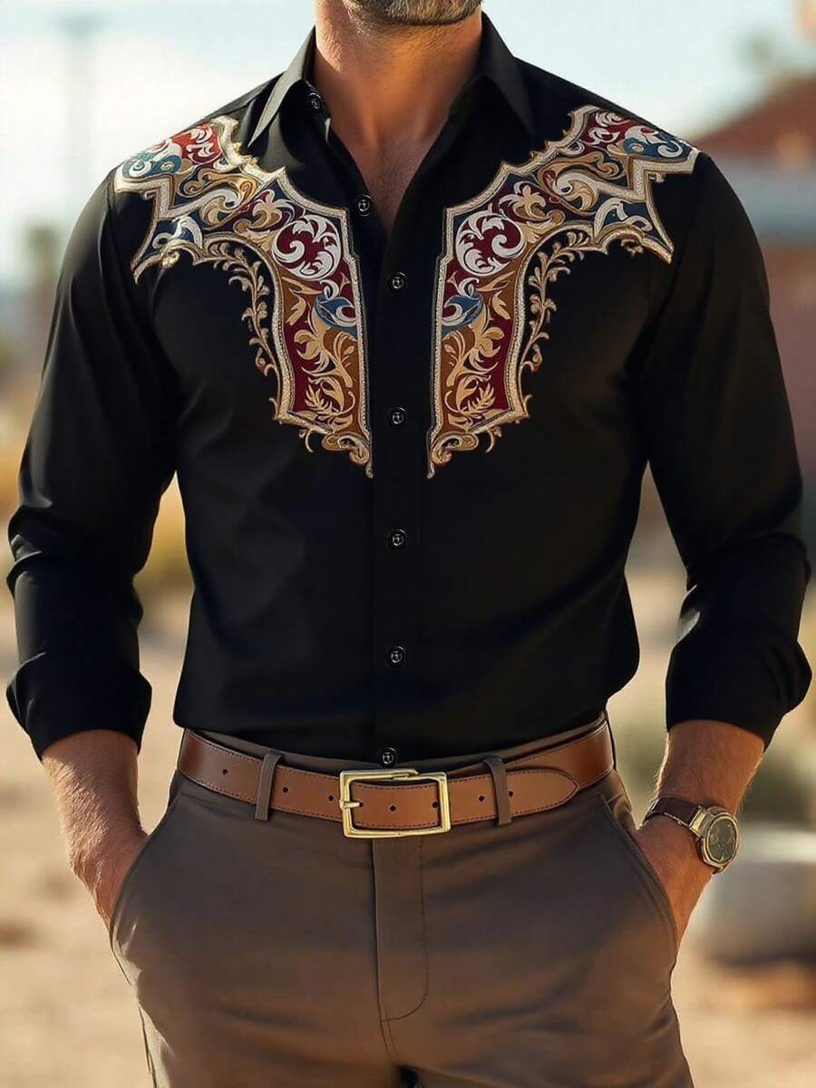 Men's Contrast Color Totem Print Shirt, Street Fashion, Long Sleeve Top