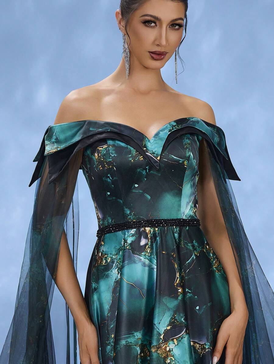 DELLA COUTURE Royal And Glamorous Dark Green Off The Shoulder Train Evening Gown, Wedding Guest Dress Exquisite Floral Print Hand-Embroidered Beads Luxury Formal Wear For Weddings, Galas And Banquets Elegant Romantic Women's Party Dress Summer Collection
