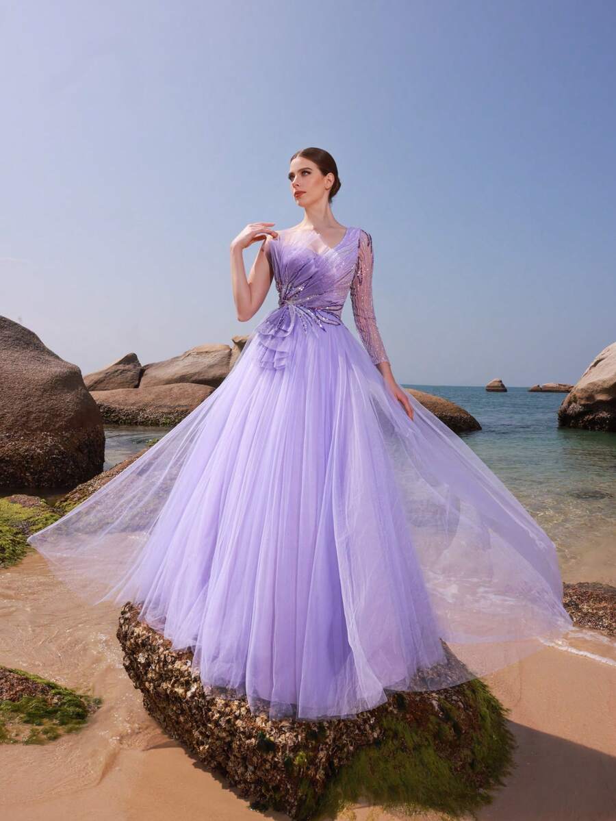 DELLA COUTURE Women Summer Elegant Light Purple Mesh Strapless Evening Gowns Handmade Beaded Exquisite Fashion Asymmetrical Neck Single Sleeve Slim Dress,Gorgeous Floor Length Dresses For Banquet, Dinner, Wedding And Other Formal Occasions Prom Guest Dress, Long Cocktail Gown, Party Dress
