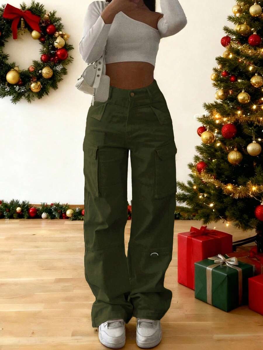 Elegant Stylish Vintage Y2K Casual Cute Cargo Pants, Green Elastic Waist Wide-Leg, Pocketed, Comfortable, Airport Outfit, Back To School, Teacher, Clubs, Birthday Parties, Halloween, Christmas, New Year, Thanksgiving, Concerts, Gym, Business, Street Wear, Spring, Summer, Autumn And Winter Styles