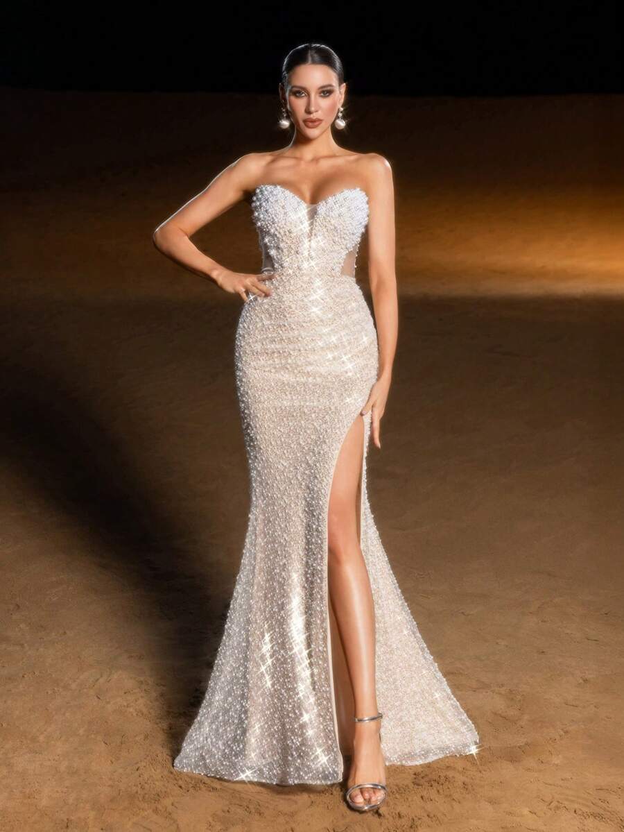 Faeriesty Haute Glamour Luxurious Beaded Sequin Mermaid Evening Gown, Lace-Up Back Detail & Graceful Mermaid Silhouette – Floor-Length Flared Skirt Ideal For Galas, Proms, Bridesmaid Dresses & High-End Evening Gatherings