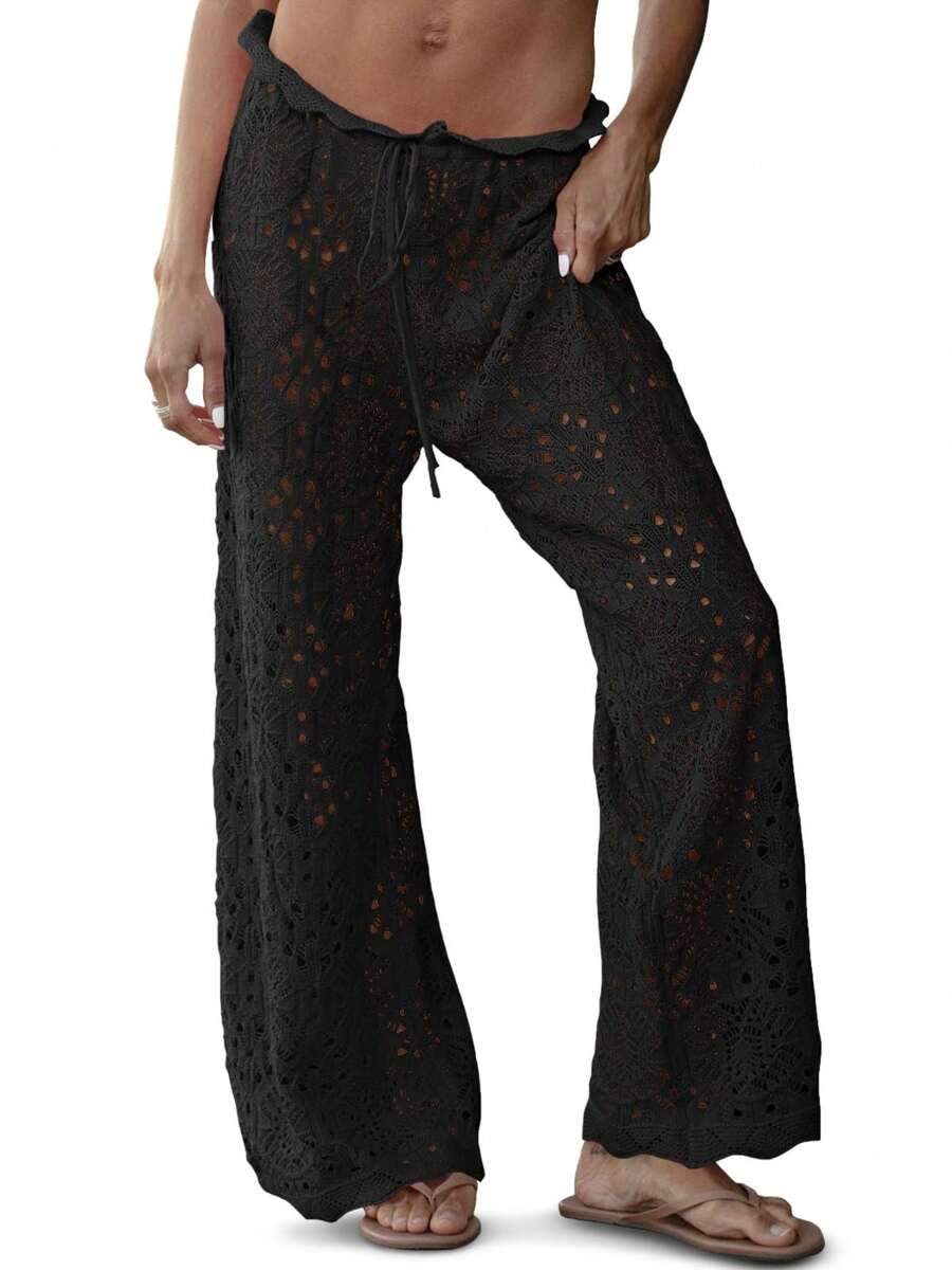Fisoew Women's Sexy Crochet Beach Pants - Sheer Mesh Coverup With Adjustable Drawstring, Y2K Boho Aesthetic, Wide Leg Palazzo Pants, Hot Girl Summer, Plus Size Available, Resort Wear, Vacation Outfits