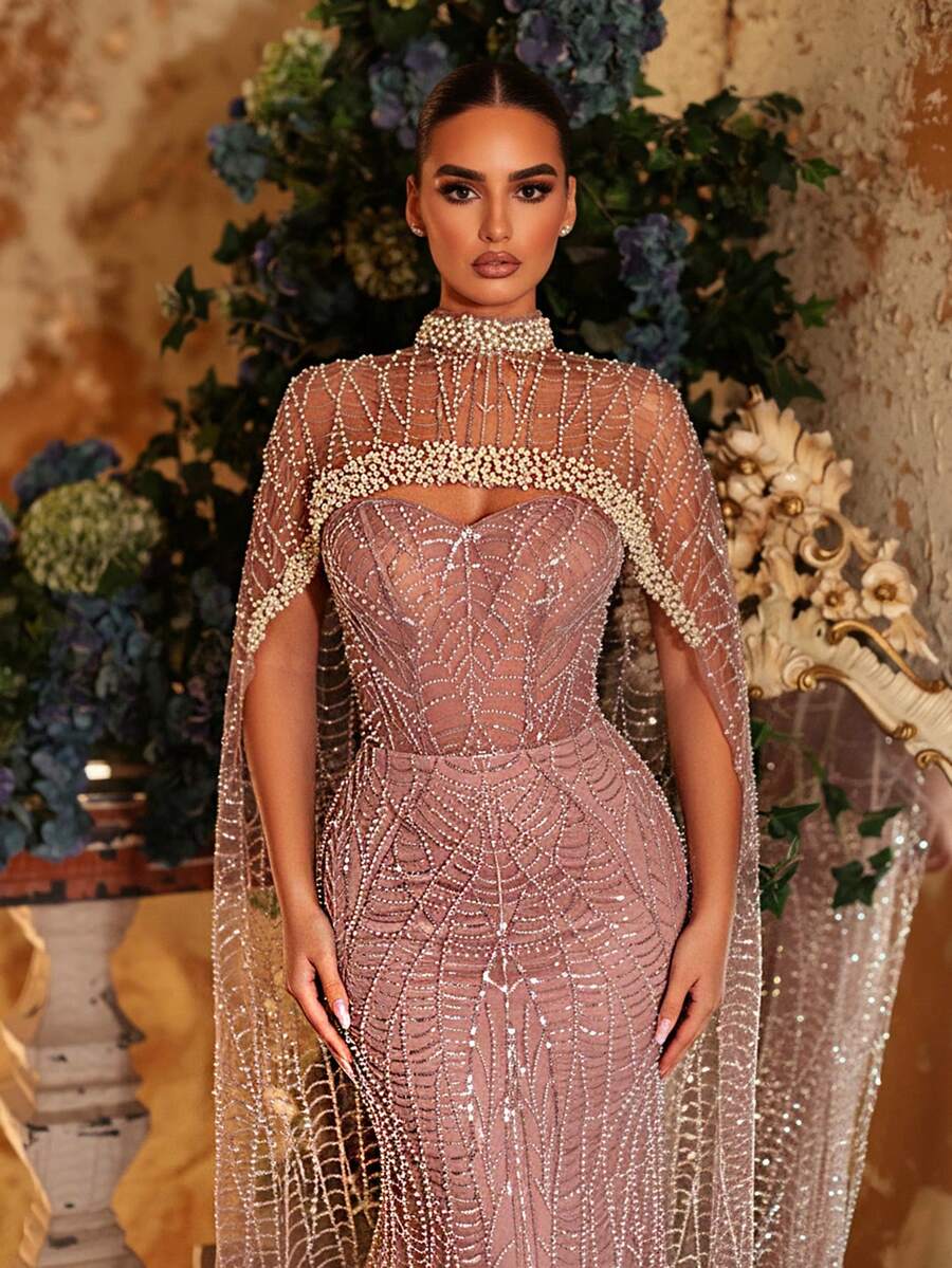Glamrae Elegant Luxurious Pearl Beaded Design Detachable Jacket Sexy Strapless Mermaid Dress, Suitable For Weddings, Parties, Vacations, Galas, Formal Occasions (Heavily Embellished)