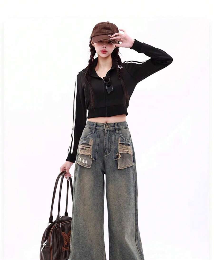 Jupkem Retro Hot Girl Ripped Jeans Women's Niche Straight Tube Versatile Ripped Pocket Irregular Design Sense Mid Waist Hot Girl Slim Fit Wide Leg Mopping Straight Tube Cute Versatile Fashion Street Pants Blue