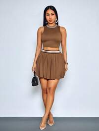 ZivahZivah New Summer Elegant Causal Vacation Commuting Brown Metallic-Embellished Halter-Neck Tank Top + Wide-Leg Pant Women Two Pieces Set. Perfect For Everyday Wear, Shopping, Travel, Vacations, Commuting, Brunch, Dates, Airport Outfits, Festivals, Music Festivals, Concerts, Western , Nomadic , Back-To-School, Afternoon Tea.