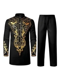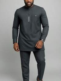 2pcs Dark Grey Dashiki Shirt And Pants Set, White Geometric Line Embroidery, Chest Pocket, Long Sleeve, Round Neck, Elastic Waist Pants, African Fashion, Men's Matching Sets, Casual & Elegant Style For Business, Party, Date, Wedding, Daily Wear, Celebrations And Ceremonies 2pcs/Set, 2025 New Men's Dashiki, Exquisite Golden Embroidery, Classic Black & Gold Contrast, Elegant Style, Long Sleeve, Round Neck, Button-Up, Elastic Waist Pants, African Clothing, Men's Casual Shirt & Pants 2-Piece Set, Streetwear, Party, Date, Wedding, Daily Wear, Cultural Events, Traditional Ceremonies #3 Bestseller