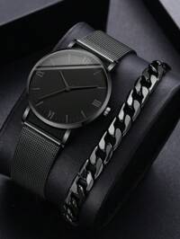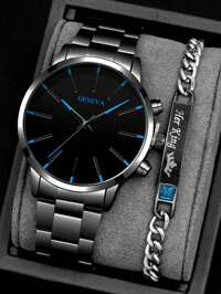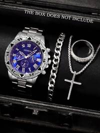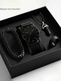 4/1 Set, Fashion Minimalist Men's Business Quartz Watch With Pointer Display, Luxury Timepiece With Simplistic Dial Design, 3-Piece Jewelry Set Including Necklace, Bracelet, And Ring, Suitable For Business, Gatherings, Parties, Timekeeping, And Gifting For Various Occasions #1 Bestseller