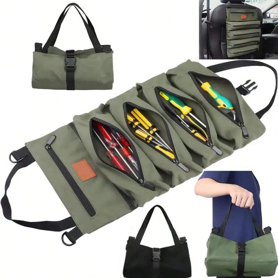 Multi-Purpose Roll-Up Tool Organizer Bag- Compact, Durable Fabric Storage Bag With 5 Zippered Pockets For Pliers, Vise Grips, Screwdrivers, Wrenches & Sockets - Perfect For Work And Outdoor Adventures