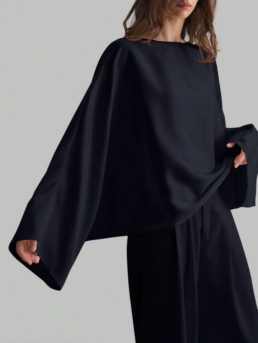 Ontre Women's Satin Off-Shoulder Oversized Sleeve Minimalist Elegant Business Casual Blouse, Autumn/Winter