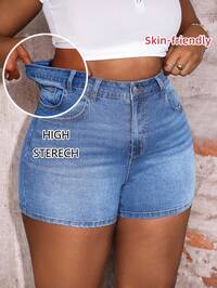 Slaydiva CURVESlaydiva Pantalones cortos de mezclilla azul talla grande, shorts casuales elásticos y ajustados de verano para mujeres, para vacaciones, vaquera, uso informal, uso empresarial casual, festivales, aeropuerto, graduación, 4 de julio, cómodos