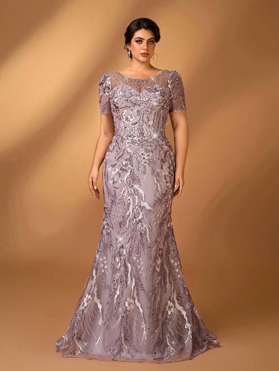 Serin Plus Size Elegant And Gorgeous Lotus Pink Round Neck Short Sleeves Sequin Embroidery Luxury Drilling Beading Craftsmanship Slim Fishtail Hem Suitable For Dinner Bachelorette Party Date Holiday Dance Wedding Event Bride Mother Dress Formal Dresses For Wedding Guest