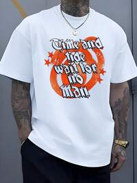Cita inspiradora "El tiempo y la espera no esperan a nadie" con estrellas naranjas audaces que simbolizan la urgencia de la vida, Camiseta de hombre talla grande 100% algodón de 220g