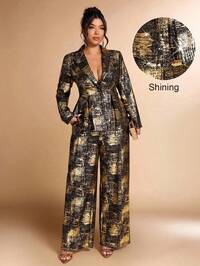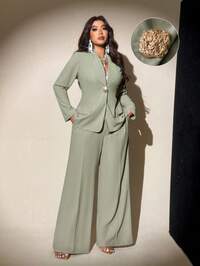 SHEIN LadySHEIN Lady Apricot Small V-Neck Short-Sleeved Waist Button-Down Asymmetrical Hem Top With Suit Pants, Plus-Size Two Pieces Suit, Plus-Size Elegant Business Office Suit, Wedding Guest Dress, Women's Summer Wear, Women's Beach Wear, Guest Dress, Women's Birthday Wear, Women's Elegant Two Pieces Suit, Elegant Two Pieces Suit, Women's Summer Wear, Vacation Wear, Women's Beach Wear, Women's Birthday Wear In Fall/Winter