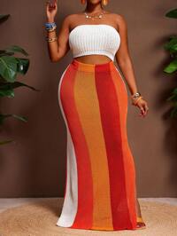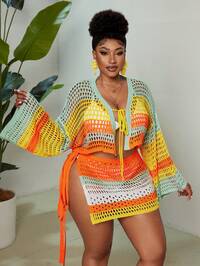SHEIN CURVE+SHEIN CURVE+ CURVE Size Women's Knitted 2-Piece Set, Multi-Color, Multicolored, Short-Sleeved Top + Mini Skirt, V-Neck, Tassel, Vacation, Seaside, Sexy, Loose, Flowing, Hot Girl, Women's Outing, Women's Knitted Set, Women's Clothing, Summer, Spring, Swimsuit, Thin Swimsuit, Knitted Swimsuit #7 Bestseller