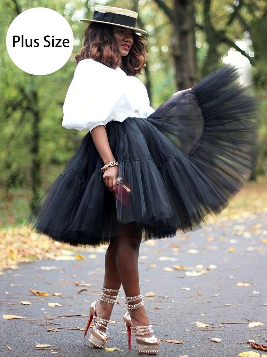 Plus Size Women Solid Color Tulle Puffy Skirt - Layered Fluffy Party Dress, Elegant And Voluminous