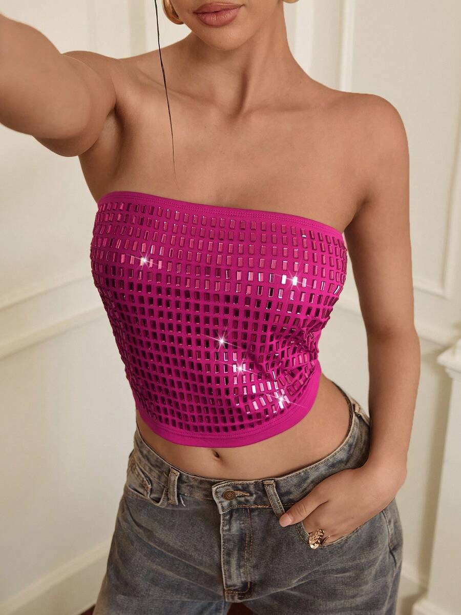 Aloruh Purple-Red Y2K Party Crop Top Camisole,Pink Top,Sleeveless Tube Top,Halloween,Halloween Costumes,Women's Halloween Costume,Christmas Women's Clothing,New Year Outfit,Thanksgiving Outfit For Women,Party Top,Elegant Women's Top,Casual,Sequin Top,Shiny Top,Glitter Top,Nightclub Top,Music Festival Concert Top
