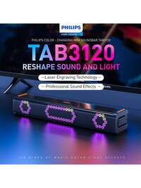 Worth Pie Marketplace Philips Mini Barra de Sonido TAB3120, Efectos de Iluminación RGB, Compatible con TV, PC, Portátil, Tableta, Teléfonos, Conexión Bluetooth 5.3 Estable, Interfaz AUX de 3.5mm, Alta Calidad de Sonido, Batería Grande de 3600mAh, Colocación Horizontal Vertical, Para Juegos, Música, Películas, Regalo