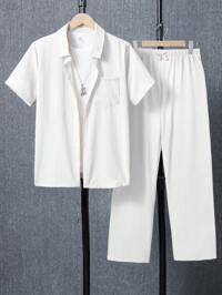 VacauraSHEIN 2pcs/Set Teen Boys' White Contrast Color Unicorn, Palm Tree, Letter Print Short Sleeve Shirt And Shorts Set, Casual, Comfortable, Versatile, Suitable For Daily Wear, School, Outings, Outdoor Activities, Music Festivals, Holidays, Beach Vacations, Summer, Spring/Summer 2 Piece Boy Summer Set Preppy Two Piece Set #5 Bestseller