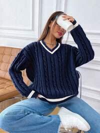 GirlismSHEIN Suéter holgado con cuello en V, estampado de pentágono y flores para adolescentes. Suéter de manga larga con estampado de bandera nacional en beige, azul, rojo y blanco, ideal para Nochevieja. Suéter térmico, de estilo callejero de moda, deportivo casual. Suéter con gráfico en inglés para adolescentes, casual, versátil, holgado, para volver al colegio, deportes, universidad, de estilo retro para otoño/invierno
