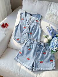 SHEIN 2pcs Tween Girls Cute Cherry Embroidery Blue Denim Sleeveless Vest And Rolled Hem Baggy Shorts Set,Summer Boho Beach Concert Rave Festival, Summer Cute Shorts, Summer Holidays,Spring,Beach For Girl, Vacation Casual Girl, Valentine Day,Suitable For Spring And Summer,Season Vintage/Beach/Sea/Elegant Graduation,Casual,Summer Holiday,Spring,Beach,,Suitable For Daily Travel, Outdoor, Home, Brunch, Tea Party, Commute, Airport Wear, #5 Bestseller