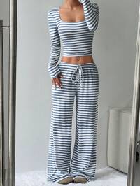 SoleiaSHEIN x Eduarda Gutierrez Soleia Women's 2pcs Set Striped Knit Crop Top & Super Low-Rise Skinny Shorts, Outfit Suitable For Vacation, Party, Christmas, Valentine's Day, Date, Beach, Cruise, Carnival, Easter, Chinese New Year #4 Bestseller