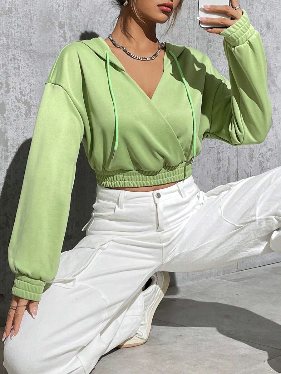 Sudadera Con Capucha De Hombro Caído De Color Sólido Para Mujer Con Cordón