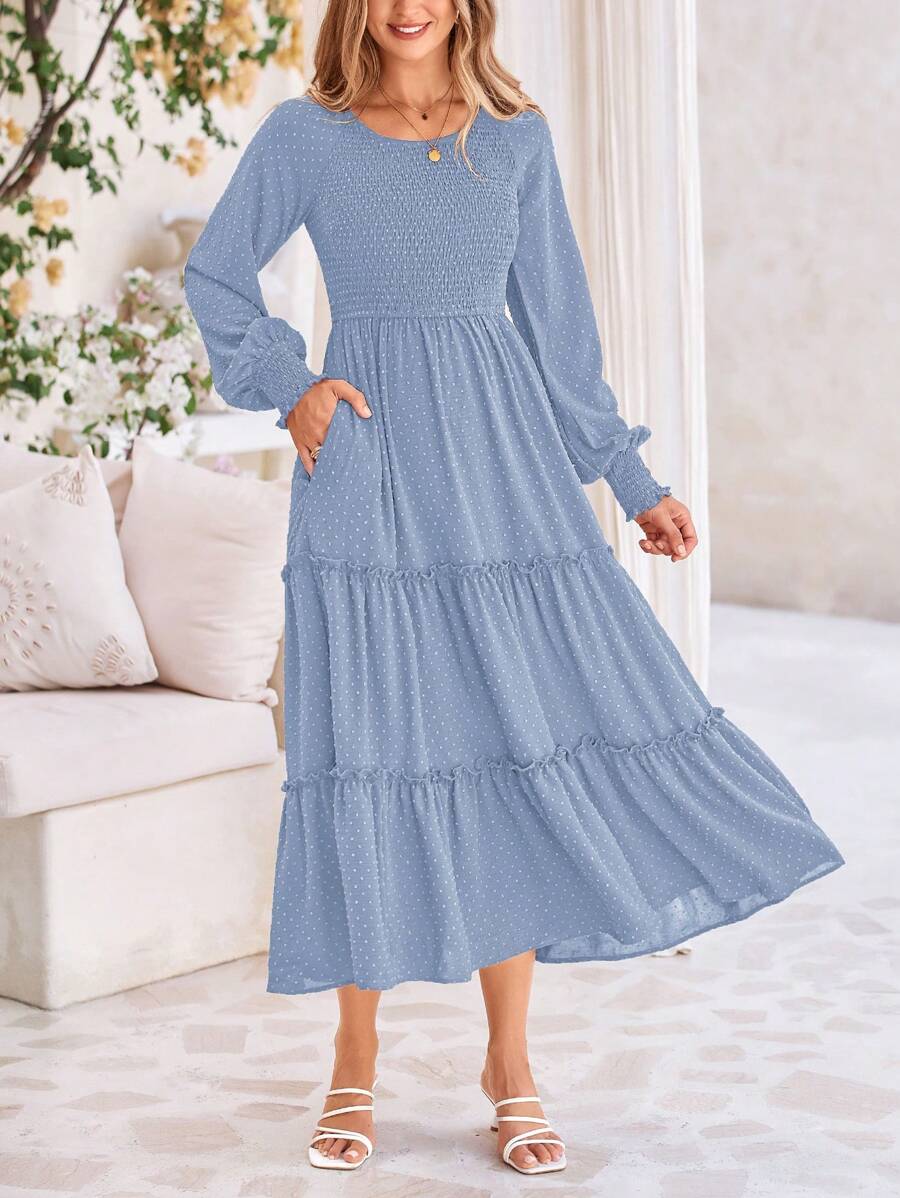 Women's Spring/Summer Bohemian Long-Waisted Dress Casual Long-Sleeved Tiered Ruffles Flowing Swiss Polka-Dot Pleated Dress With Pockets